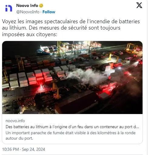 據外媒的報道稱,當地時間 9 月 23 日(星期一)下午 3 點 15 分左右,加拿大蒙特利爾港碼頭(Montreal)上一裝有 15 噸 鋰離子電池 的集裝箱著火。