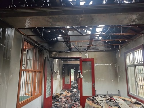 著火建筑為緊挨著一棟二層樓房旁的三間磚混結構的偏房,用途為廚房、餐廳和雜物間等,屋頂被燒穿,火勢處于下降階段。
