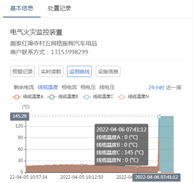 2022年04月06日07點41分04秒,蘭山街道智慧消防中心(以下簡稱“中心”)一級平臺接收到顏家紅埠寺村五網格振輝汽車用品商鋪中安裝的智慧用電設備發出的溫度預警
