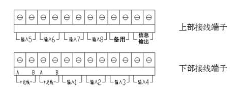 如下圖所示的接線端子排,按面板上的接線銘牌所示,在“總線”處接入通訊線,A為正(+)、B為負(-),根據不同功能的電氣火災監控探測器( L剩余電流式、W 測溫式),在輸入1、2、3、4、5、6、7、8處分別接入 1-8 路剩余電流互感器或溫度傳感器(不分極性)。