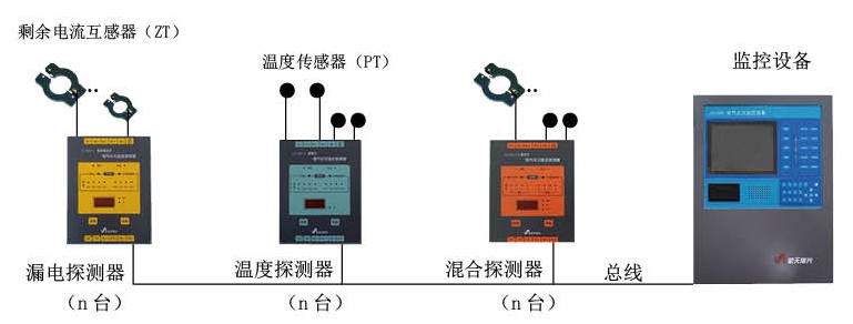 電氣火災監控設備安裝在值班室,以總線方式與多臺監控探測器相連,接受各監控探測器發送的漏電、溫度報警信息構成分散監測集中報警的電氣火災監控系統。