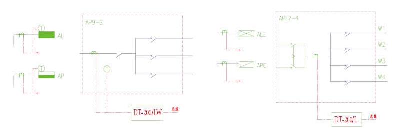 例:N 臺 DT-200/L 或 DT-200/W 或 DT-200/LW 電氣火災監控探測器與 DJ-800 電氣火災監控設備最多構成 3760 路分散監測所在線路剩余電流值、溫度值集中報警的電氣火災監控系統。