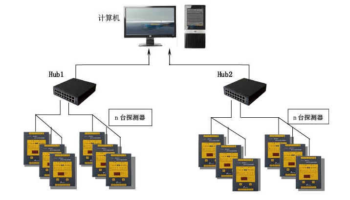 對于有多個變電室的大型用電單位,可設置多個電氣火災監控子電氣火災監控支路,系統的 Hub 集線器把報警信號傳給總值班室的計算機,構成計算機集中監測的集散管理系統。如下圖所示: