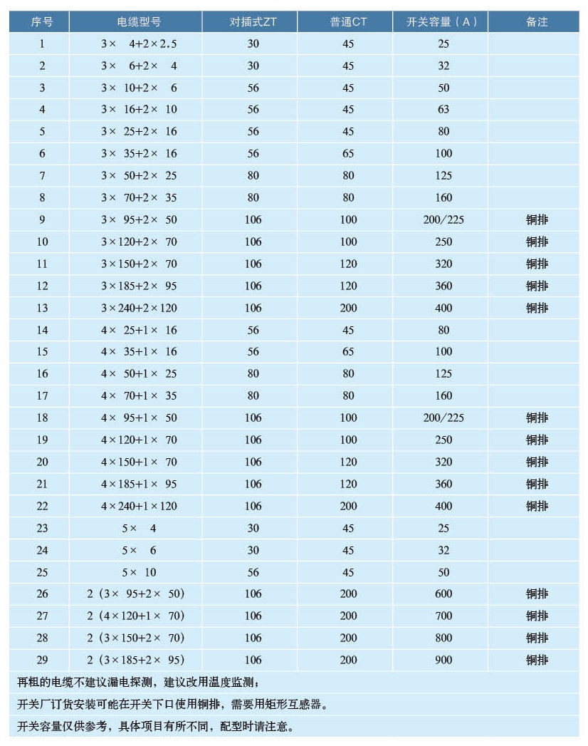 第十節 電纜型號、空開容量與互感器選型表
