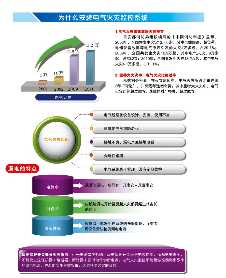 電氣火災主要是由于線路漏電、短路、過流、接觸電阻過大或絕緣擊穿造成高溫、電火花和電弧等所造成的。其中,發生概率最高、危害最大的是接地故障產生的電弧性短路,這是因為漏電時形成的電弧具有很大的阻抗和電壓降,它限制了故障電流,使過電流保護器不能動作,而漏電幾百毫安電弧產生的局部高溫可達 2000℃ 以上,可以引燃臨近的可燃物而引起電氣火災。就電氣火災而言,接地故障遠較一般短路故障具有更大的危害性,它是最常見最多發的電氣火災起火源。